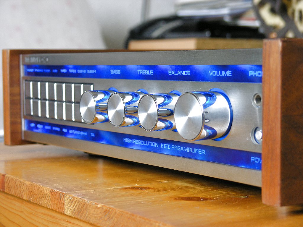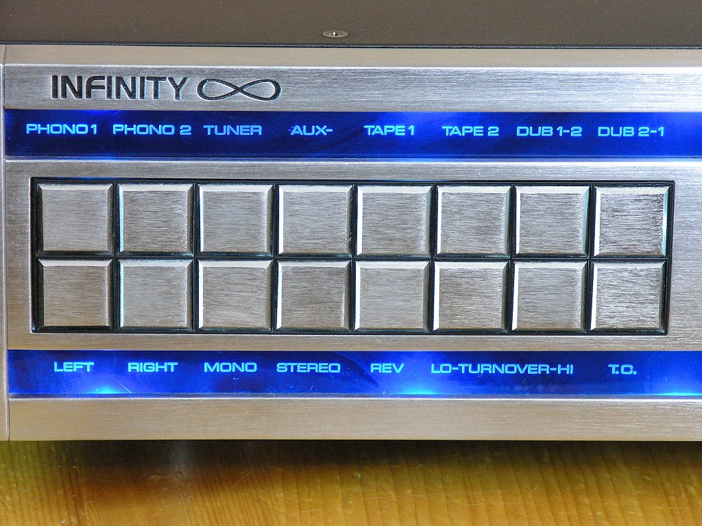 Den meisten Infinity Freunde dürfte das noch gar nicht bekannt sein, dass Infinity auch mal einen Vorverstärker angeboten hat. Dieser wurde nur sehr limitiert gebaut. Er hat diverse, mir nicht bekannte Bedienknöpfe, ich vermute Einganswahl, Loudness, Filter etc., die üblichen Klangregler, Balance und Volume. Die Funktionsanzeigen leuchten in einem edlen Blau oder Rot.